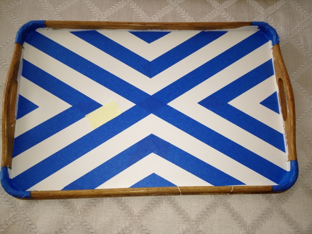 To start, she painted the inside of the tray with a base of white and let that dry overnight. Then she used blue painter’s tape to mask off this great stripe pattern. Chevron and zig-zag patterns are so popular right now, and this is a great play on that idea, without feeling overly trendy. There are metal corners on her tray, so she masked those off, too.