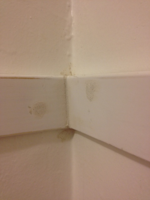 Luckily, this step can hide a multitude of errors, and there were a few! Use wood filler to cover the nail holes and any larger gaps (gaps? What gaps?). Sand the patched areas smooth. Then use paintable caulk to run a line along the top of the molding to fill the small space between the wood and the wall.