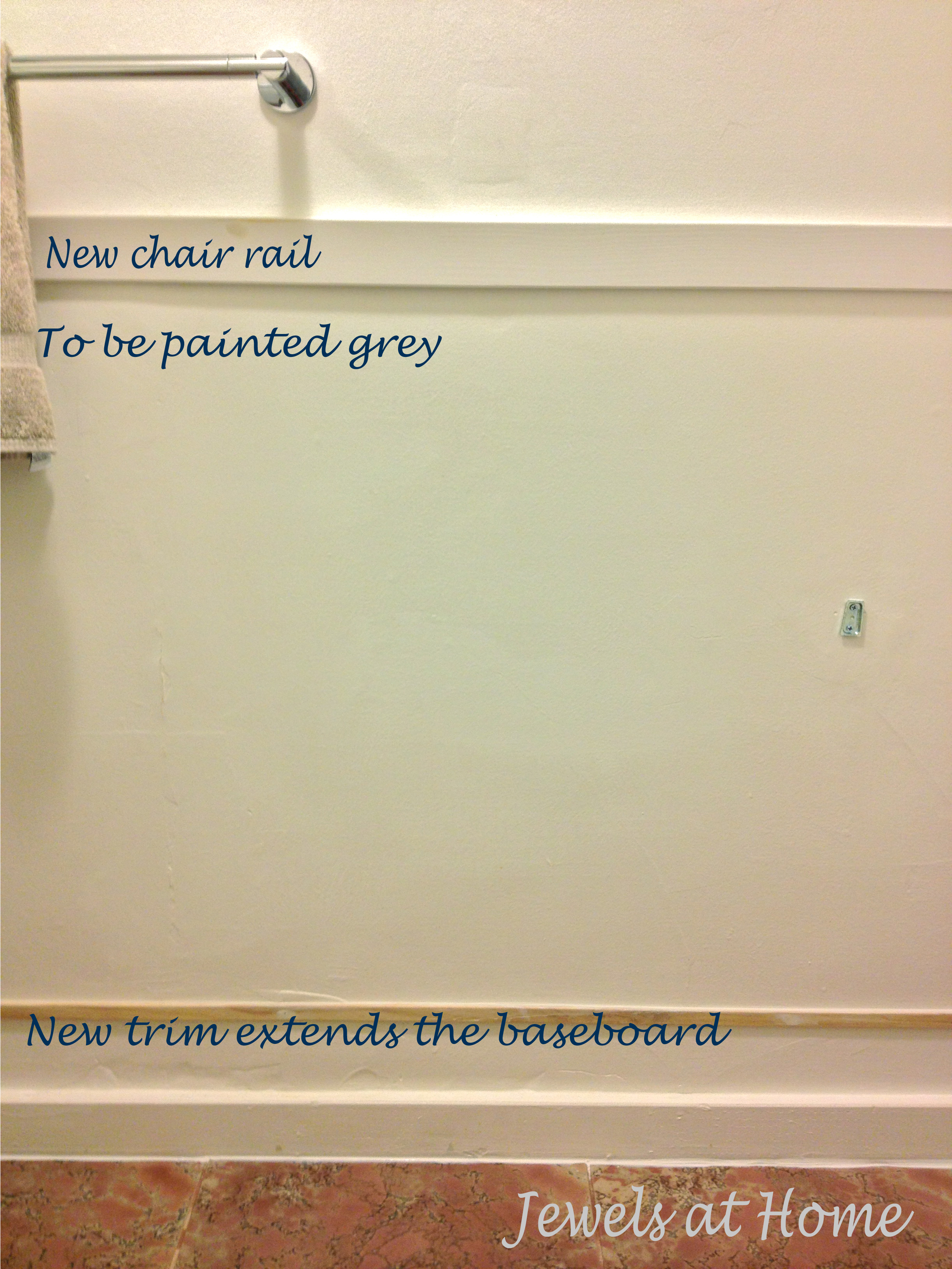 Measure each wall. If you have an old house like ours, measure at the exact height you will mount each piece, since the walls may not be even. Chair rail is usually mounted 36″ +/- 2″ from the floor. I picked the height of the baseboard to avoid some plumbing. A lot of older and more expensive homes have high baseboards, so this is a great trick to mimic that look, without using a lot of trim, since you’ll just be painting the wall between the old baseboard and the new trim all one color, so it looks like a single tall piece of molding.