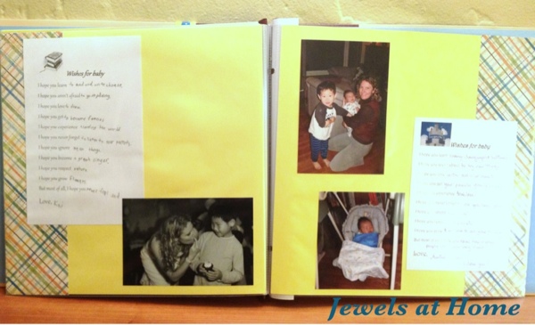 The inspiration for this scrapbook came when I was collecting ideas for the shower and came across the idea of a list of “wishes” each guest could fill out for baby. This was such a sweet idea that I knew I wanted to incorporate.
