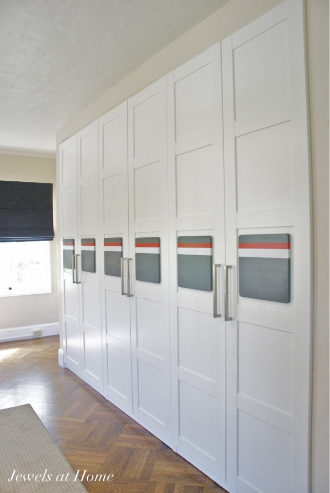 The boys’ room has a huge wall of closets that made the perfect blank slate for this project. The closets, by the way, are amazing. This is a favorite trick of the design-build team that did our renovation – they take Ikea Pax closets and frame them with drywall, for inexpensive built-in closets. Since all the parts are pre-cut, the cost is a fraction of custom cabinetry, and Ikea has tons of options for customizing the insides to maximize storage. We were able to eliminate the boys’ dressers completely, since all their clothes fit inside the closets, with plenty of room to spare for other storage. I chose the Bergsbo closet doors, which match our paneled doors well (Steve commented the other day, “Hey, our closet doors go really well with our regular doors.” Yeah, honey, do you think that was an accident?). I added these 10″ square bar pulls for a clean, contemporary look.