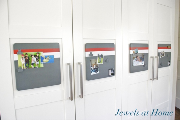 Steve took our two older boys on a camping trip this weekend. I wanted to surprise them all with a few little projects when they got home, so this is what I did for the boys’ room. They have lots of pictures, cards, and art that collect in little piles, and I wanted to make a place for the boys to display and enjoy them.