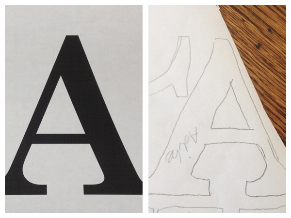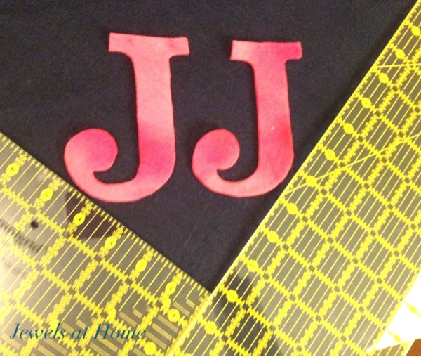 I can do appliques in my sleep after all the recent appliqued clothes I’ve made for the kids! I decided to do first and last initials for our monograms, since we had a few kids at the party with the same first initial. I printed the initials in Century Schoolbook font in 430 pt bold. I then traced them in reverse onto the Heat ‘n Bond. I held them up to a window to trace.