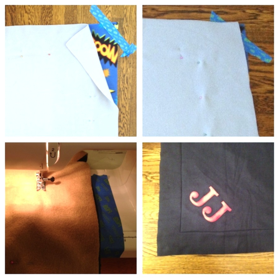 I wanted to apply the letters before sewing the blankets, so the stitching would not show through on the other side of the blanket. I had trimmed the fleece for each blanket already, so I knew the finished size. I then used rulers to mark off 5″ from each edge (3.5″ for the fringe and 1.5″ for spacing) and placed my letters in the corner (first picture below). I then sewed around each letter to secure it (second picture below).