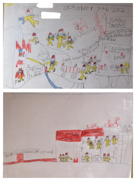 As a finishing touch inside the fire house, I “hung” these charming firefighter scenes that J’s brother drew for him.