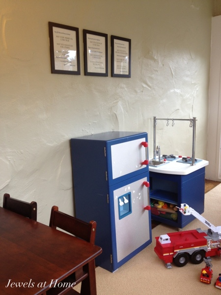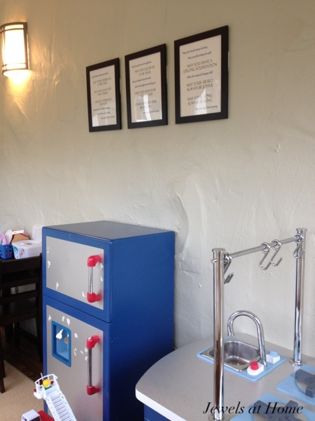 If you want to change things around and create your own version, the fonts I used were Gabriola and Felix Titling. The frames are NYTTJA frames from Ikea. They are nothing fancy, but the lightweight design (the fronts are plastic, not glass), work well, because the playroom walls are exterior stucco, and I have had no luck putting nails in it, so I used these trusty 3M Command Picture-Hanging Strips. They are advertised as being able to hold a lot of weight, but I don’t like to challenge them!