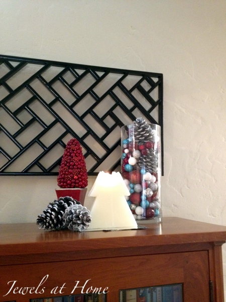 On the other side of the living-dining room, I added a tray with some candles and sprayed silver pine cones.