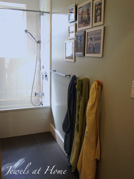 My kids never seem to successfully get their towels back on a towel bar, so I opted for these robe hooks. The adorable monogrammed hooded towels from Pottery Barn Kids were a gift from a dear friend when our youngest was born, and they fit perfectly here.