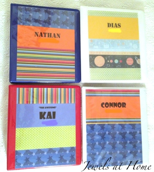 I printed out their names on colored paper and pieced together done fun patterned paper to make each cover unique.