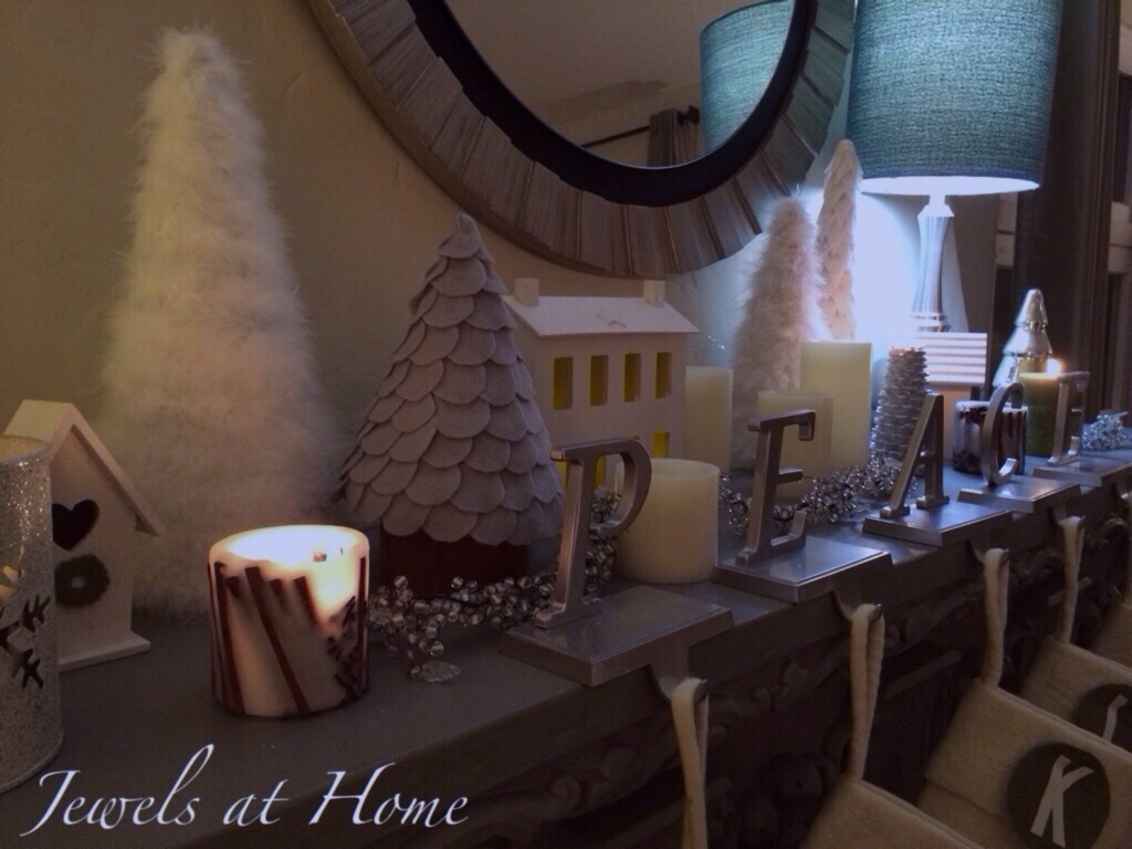 This year’s mantel matches the rest of our house, with white decorations setting a wintery scene.