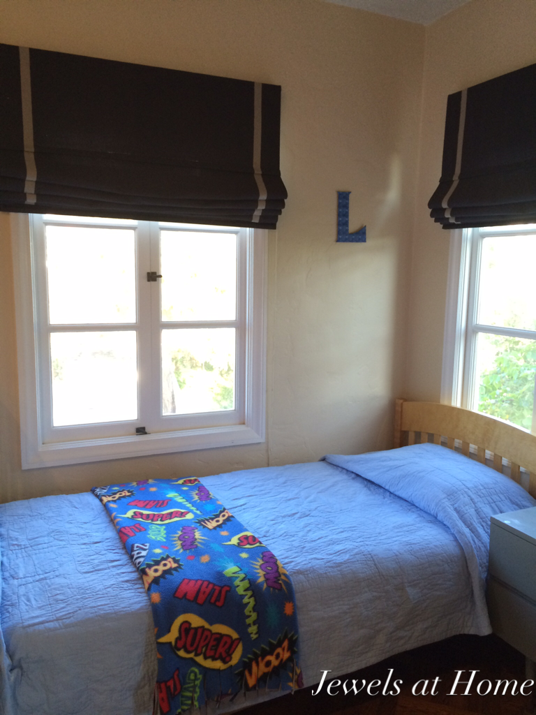I really like the look of fabric shades with a ribbon border. I had created a border on the curtains in our master bath, and I love how that turned out. For the boys, I wanted something very simple. I found some cotton twill tape and used tacky glue to attach it to the shades. It’s holding up very well so far. You’ll have to experiment with your own shades, but for reference, the twill tape I used is 1 1/4 inches wide, and I attached it to the shades 3 1/2 inches from the edge.