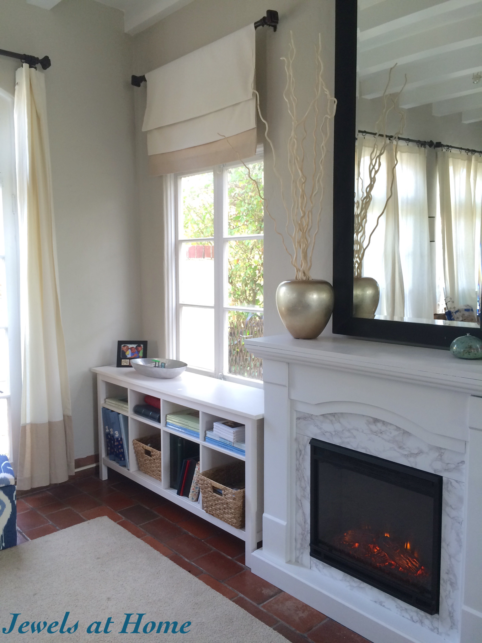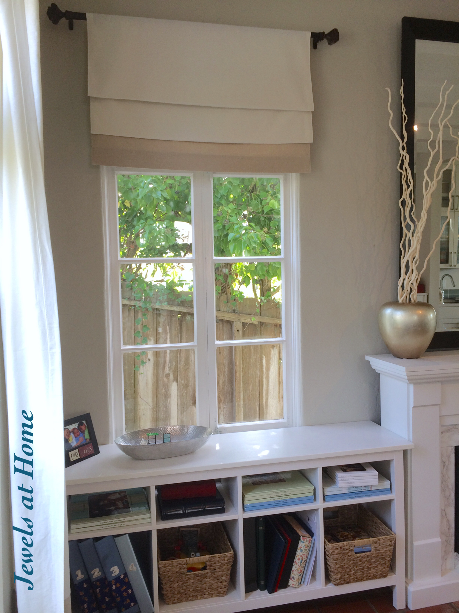 We needed those functional shades for the bedroom, but in other places, a fixed shade works just as well, like this one in our master bath. For our updated family room, I wanted the look of Roman shades, but I didn’t need the function. These new shades I made are fixed, meaning you can’t raise or lower them. It works for our location, since the windows face a private area and are shielded from direct sun by greenery.