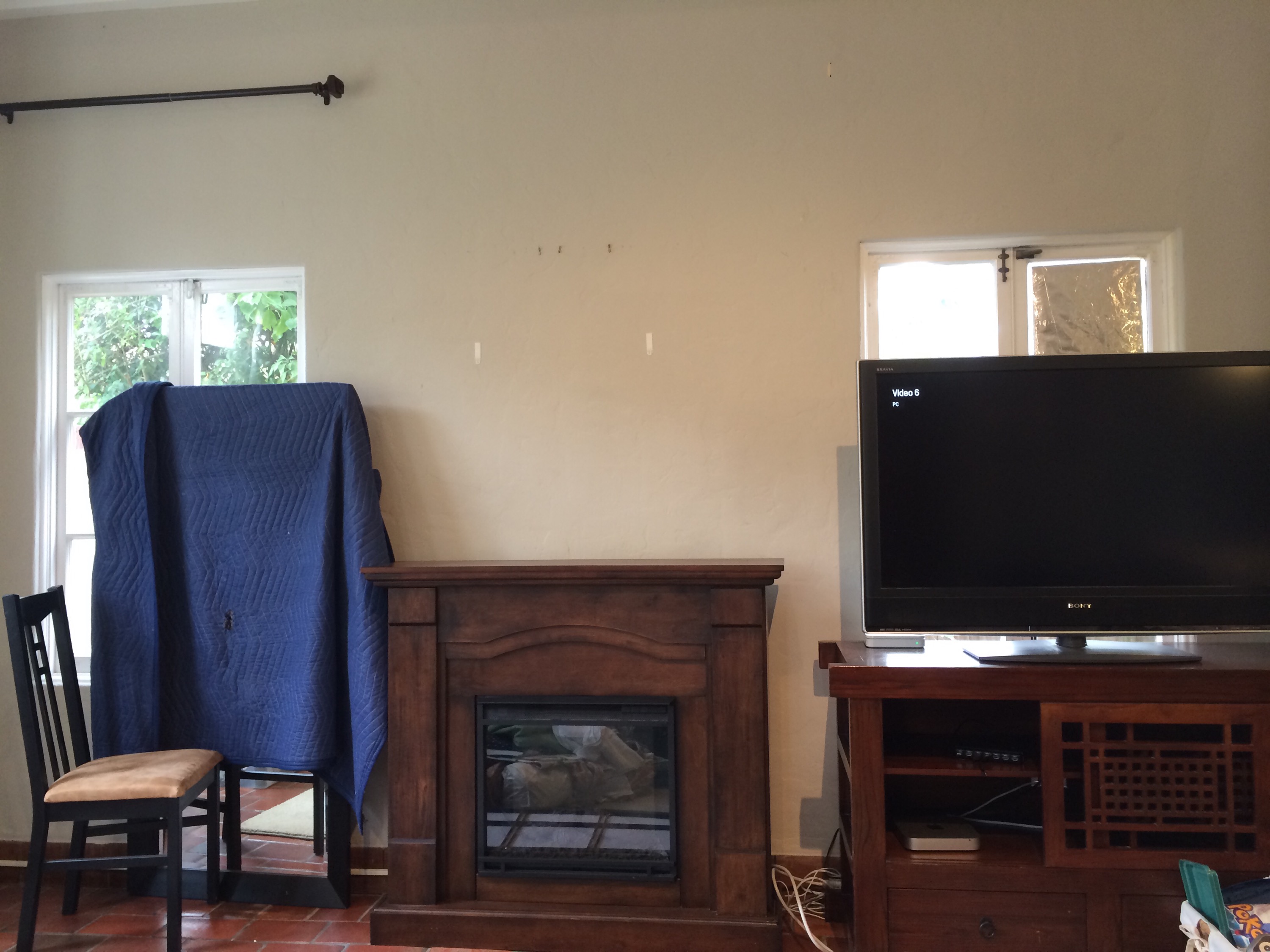 My starting point was a completely blank wall with two windows. I bought an electric fireplace a few years ago to help warm up the space – figuratively and literally – and while it’s pretty simple and no frills, we’ve gotten a lot of enjoyment out of it.