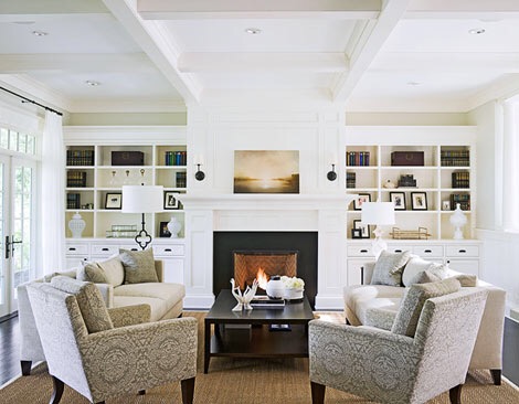 I had been swooning over inspiration rooms like these, with their crisp white fireplaces and shelving.