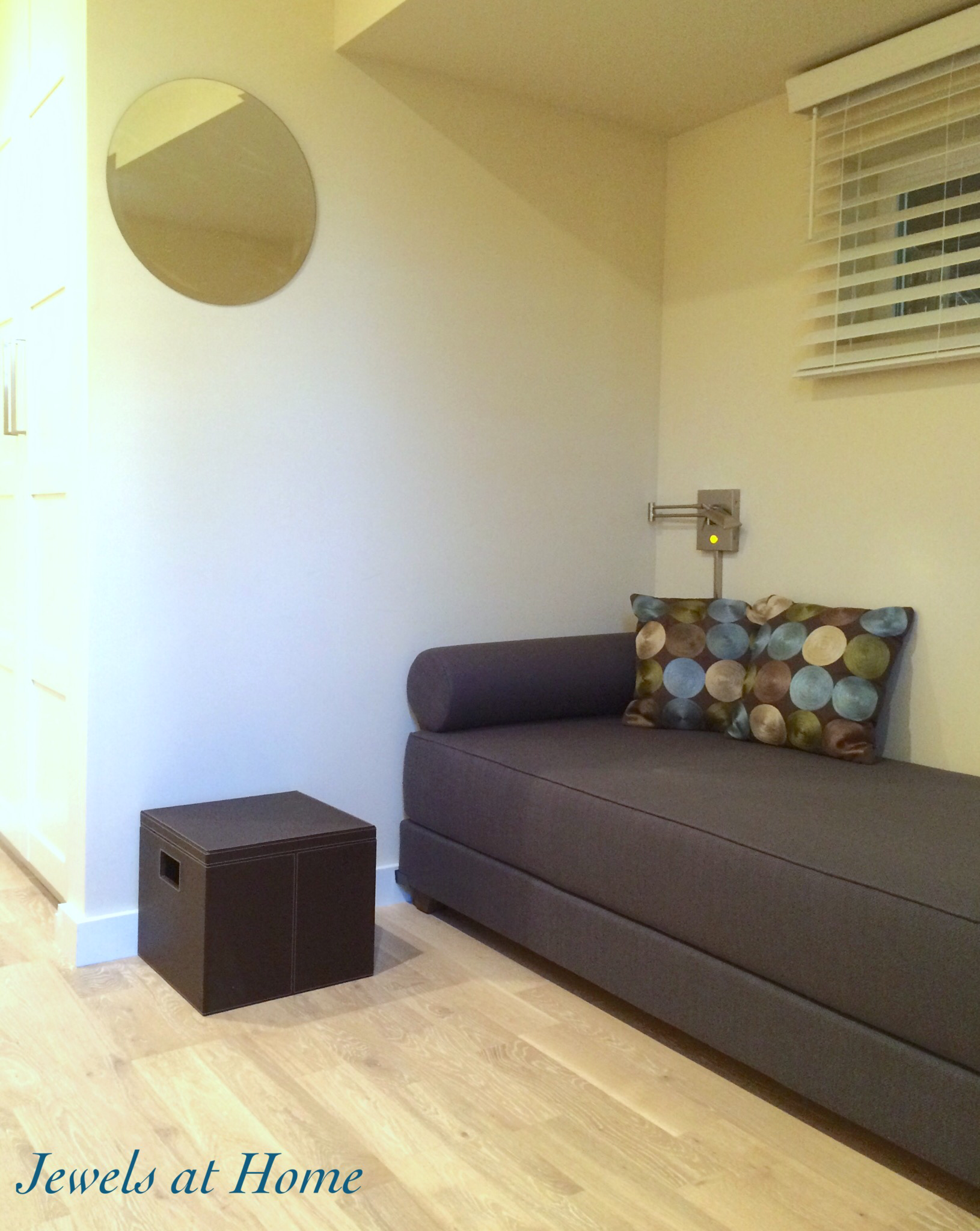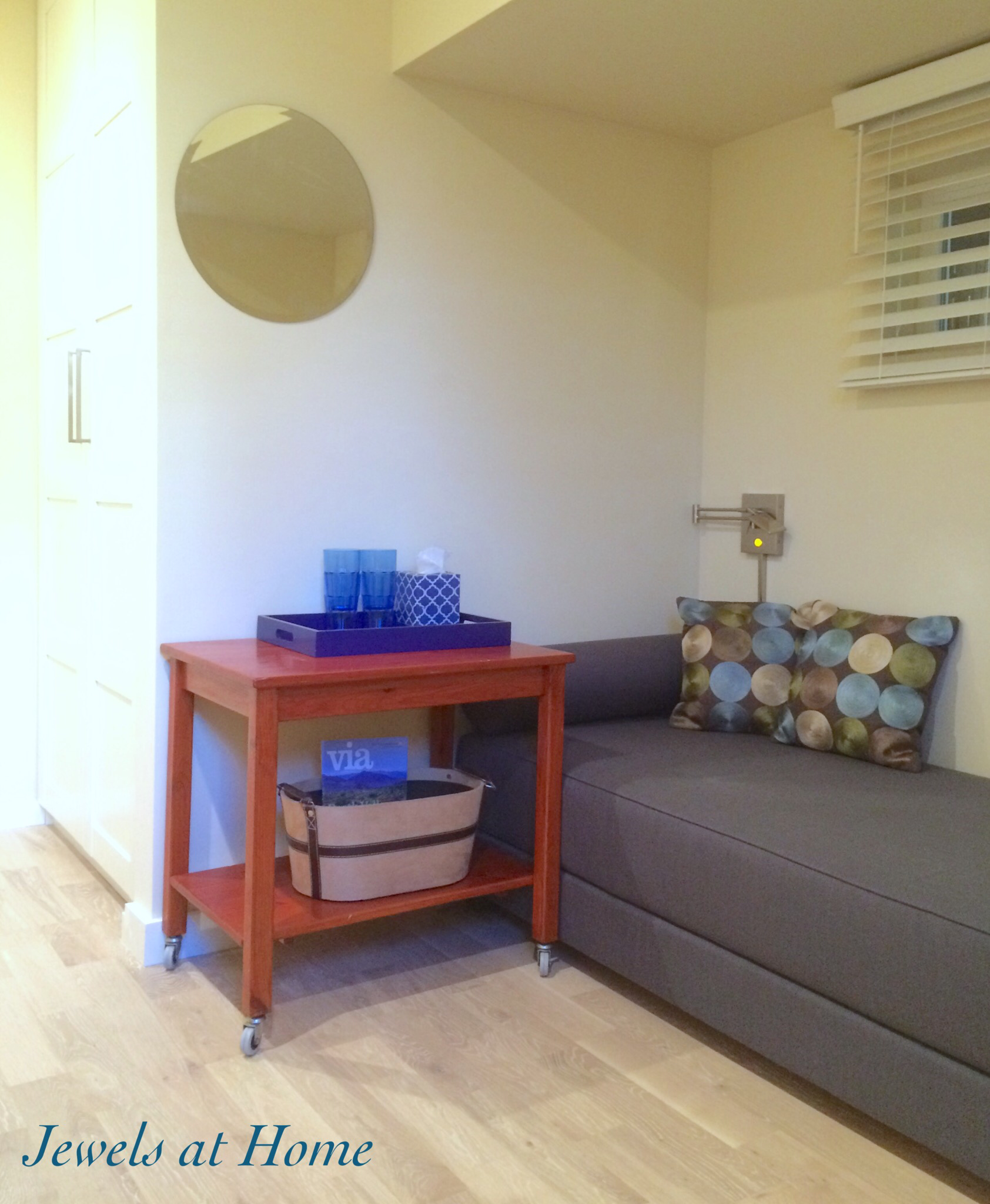 Window coverings – it’s important to have good like control in your guestroom, since you may have visitors who are jetlagged and need to sleep when it’s light outside. Our guestroom is in the basement, which means that the windows are at ground level, so these wood blinds were the perfect solution for privacy and light control.