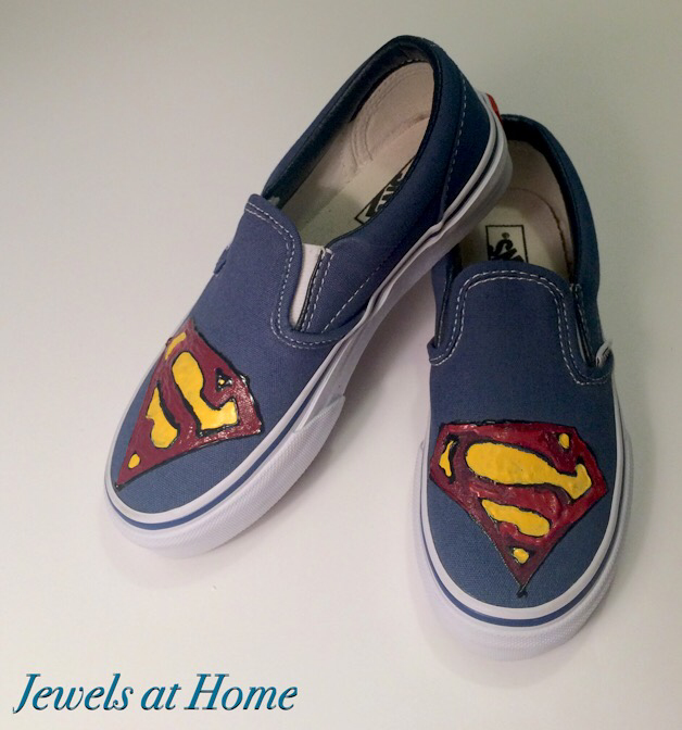 Of course, he wants all the Superhero-themed shoes, and I am not saying that I have never given in to these wishes, but generally, I try to avoid the commercial superhero shoes, because they have just a few too many lights and colors for my taste. That being said, I like to keep my little guys happy, so I decided to get him a pair of plain blue slip-on Vans and paint a Superman log on them with dimensional fabric paint