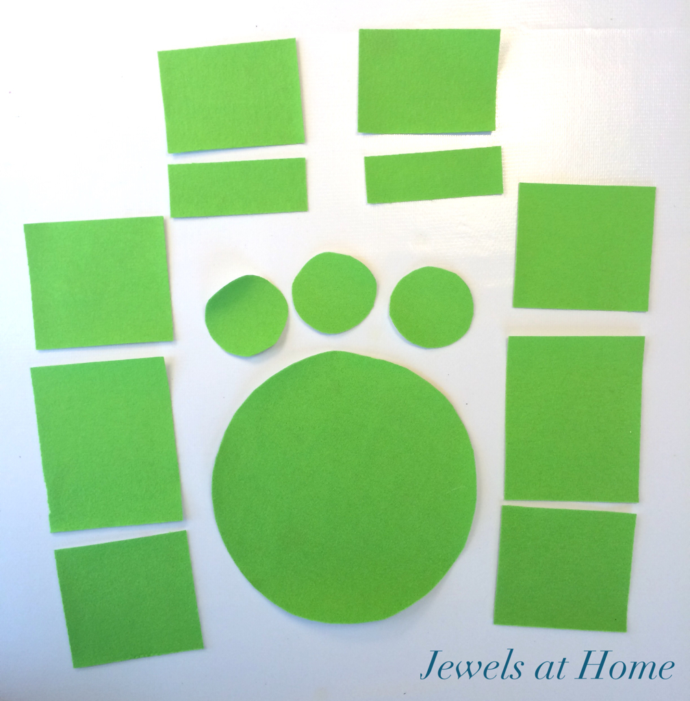 Next, I ironed some Heat’n Bond to the main green fabric and cut the following pieces: