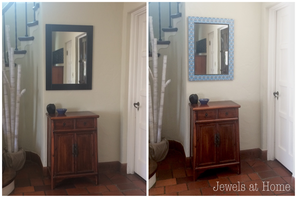 This space definitely needs a brighter and more colorful feel, and I decided to start by adding some pretty paper to our foyer mirror.