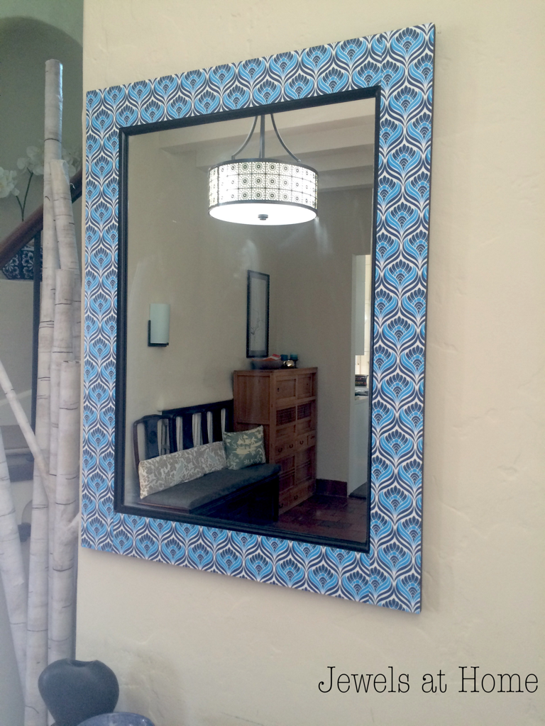 I originally had a plain mirror there, one that actually came with a bathroom vanity I ordered for our guest room. It was very simple and the perfect blank slate for something decorative. I had bought this pretty blue paper from Paper Source a while ago, and it has been waiting for a project! I used to use Mod Podge for decoupage, but I recently bought a tub of Yes All-Purpose Stik Flat Glue to try, and it has been working well, without the odor of Mod Podge.