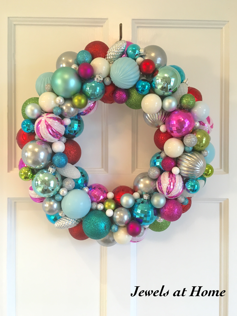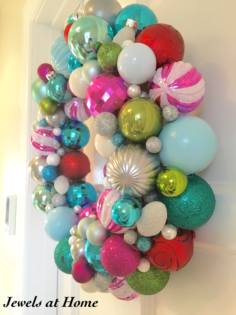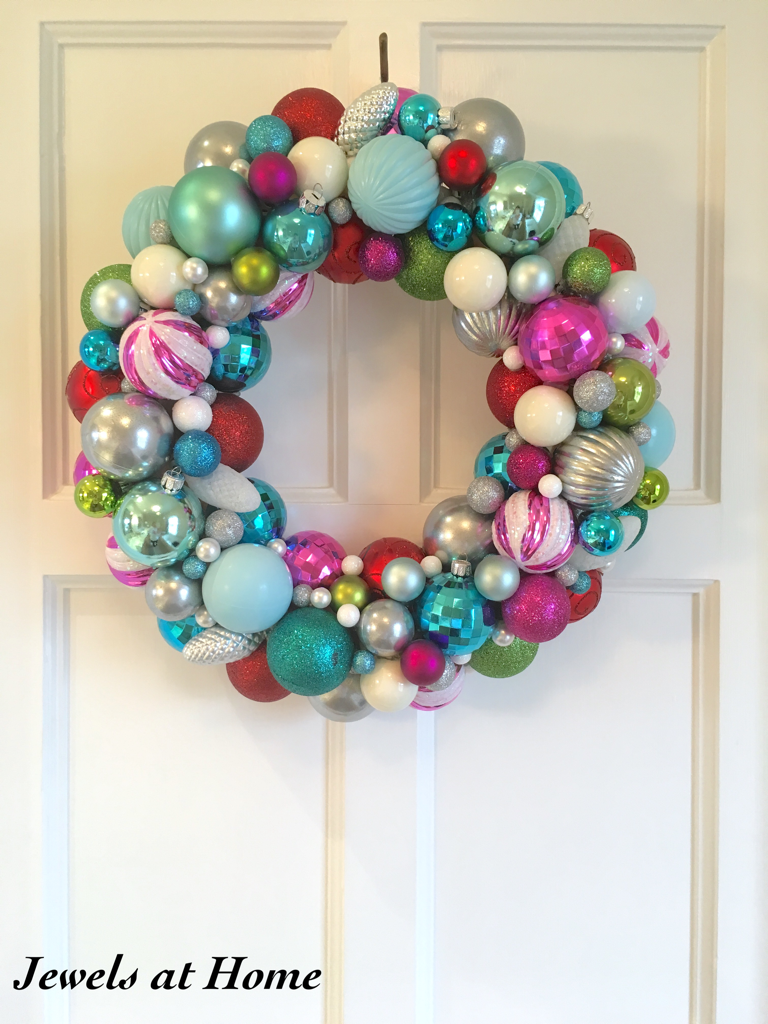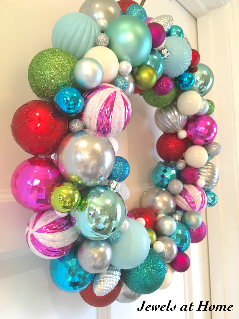 To attach the ornaments, I hot-glued a ring of the large balls in this year’s colors of pink, turquoise, and red around the entire outside and inside of the wreath base. I then added a few large ornaments to the top and filled in with medium and smaller ornaments. I included a few pine cone ornaments to change up the look. Also, I kept the hangers visible on a handful of the ornaments for more visual interest.