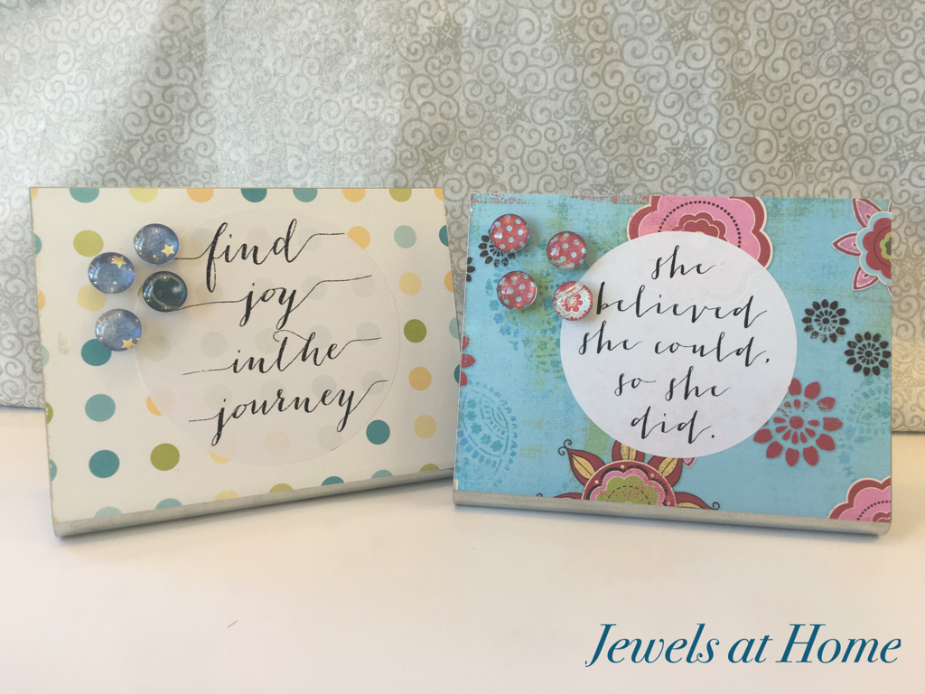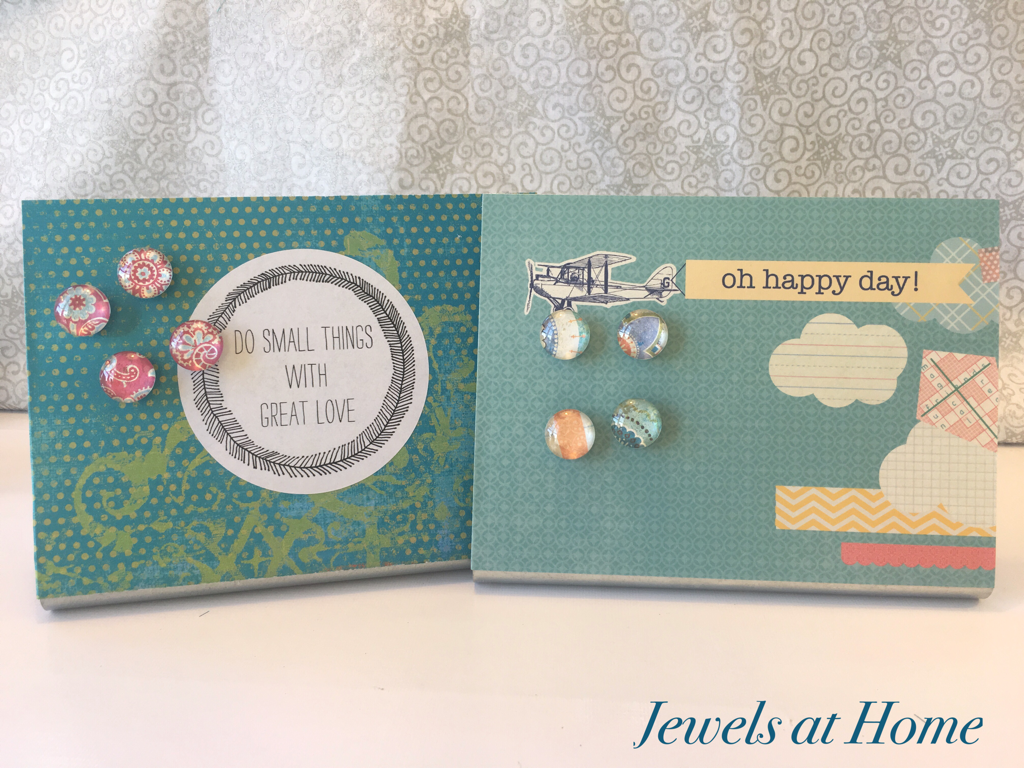 For this year’s gift, I knew that I wanted to do a project using scrapbook paper. I have a little (tiny, really) bit of an addiction to pretty papers, and I wanted a way to share them. After looking through lots of ideas on Pinterest, I decided to make these desktop magnet boards with coordinating glass cabochon magnets. My inspiration included similar boards from Papemelroti in the Philippines and Leanne from Organize and Decorate Everything.