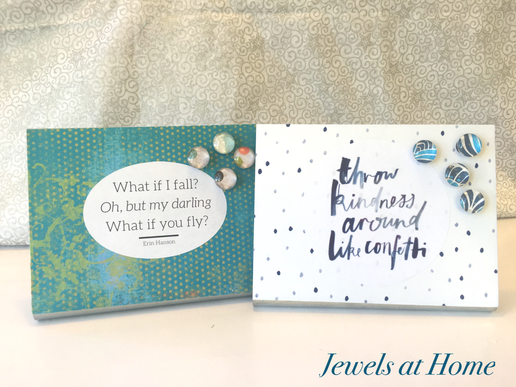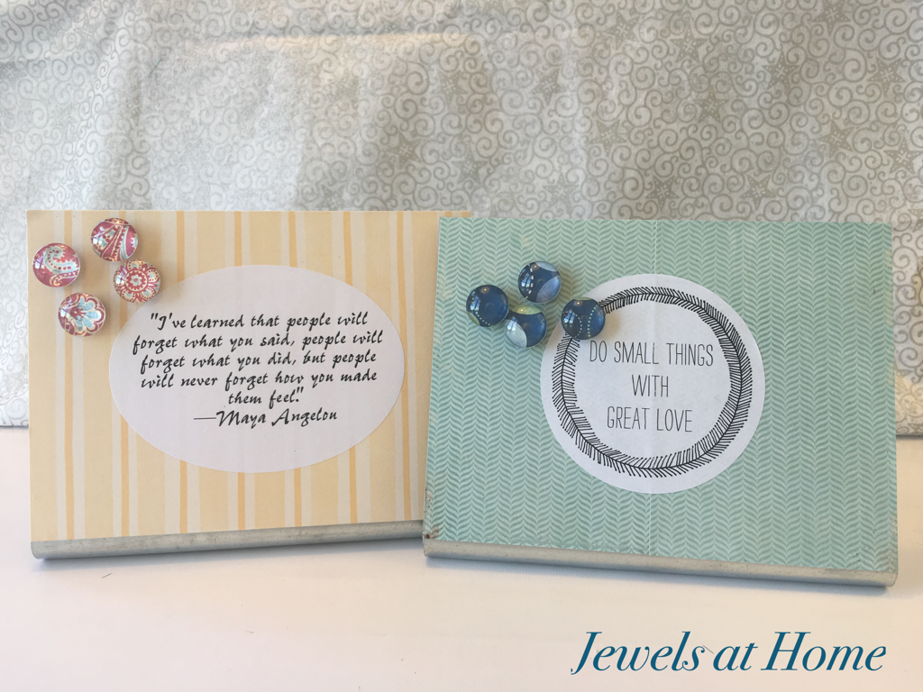 This year’s holiday gifts for our teachers and friends are these desktop magnet boards with coordinating glass cabochon magnets. I love seeing all the colors and patterns come together with the inspirational quotes. You can find the supply list and instructions in the first post. There are so many ways to combine the papers and quotes that I wanted to show you some more in this post!