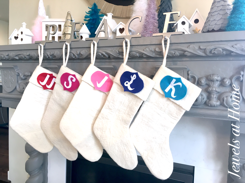 I used felt in our Christmas colors of red, pink, and blue and added white felt monograms. I attached them to the stockings with safety pins, so it will be easy to change them again, when needed! It’s amazing how this small project completely transforms the look of our stockings and mantel!