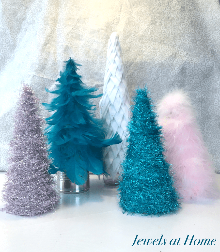 A few years ago, I made felt Christmas trees and yarn and feather boa trees, so it was easy to add a few in pastel shades.