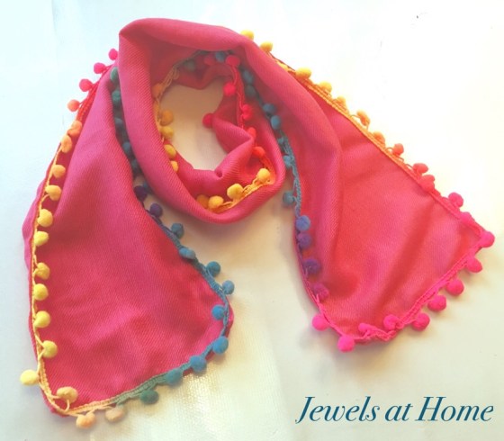 At K’s soccer game, I saw one of our friends had a cute scarf with pom-pom trim, and I thought it would be fun to make my own! Of course, it would not be a true obsession if I made just one… The first set of scarves I made were for my nieces for Christmas. These are pink wooly scarves with rainbow pom-pom trim. So cute! I have enough trim left over to make myself an infinity scarf after Christmas, if I’m feeling bold enough for these colors.