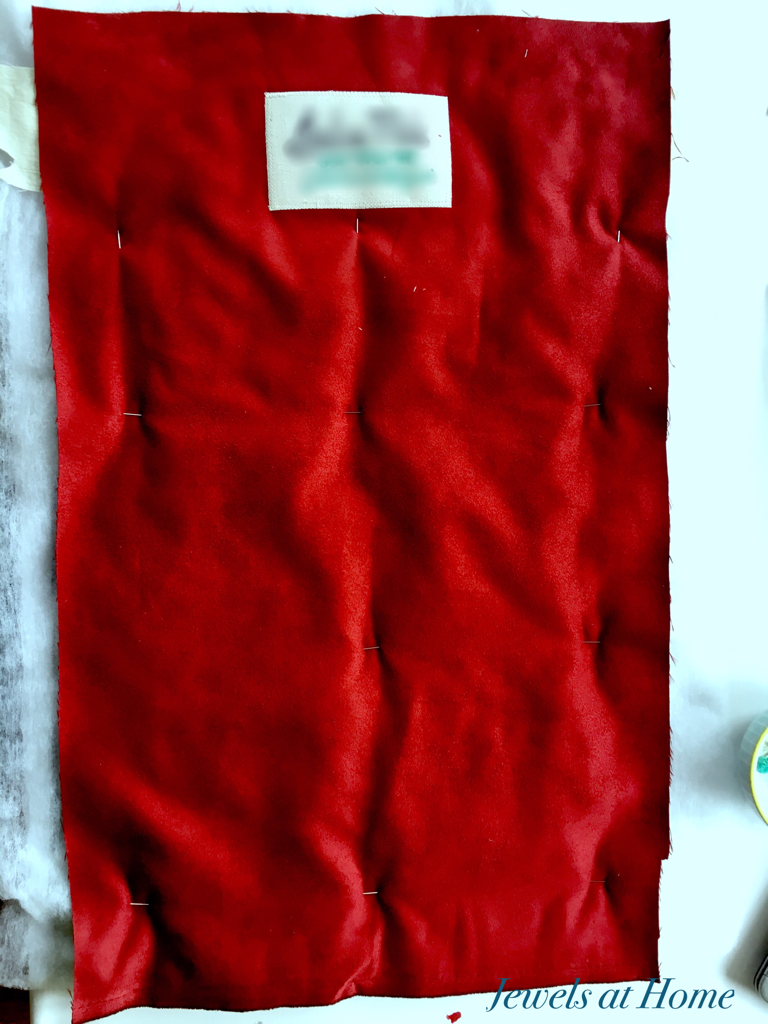 Next, I laid all three layers together and pinned them to keep them in place. I sewed quilting lines through all three fabrics for most of the sleeve, but I did want to sew across my name tag, so for the top section, I used some scrap fabric for backing and just sewed the outside fabric and batting to the scrap fabric, also shown below (folded over).