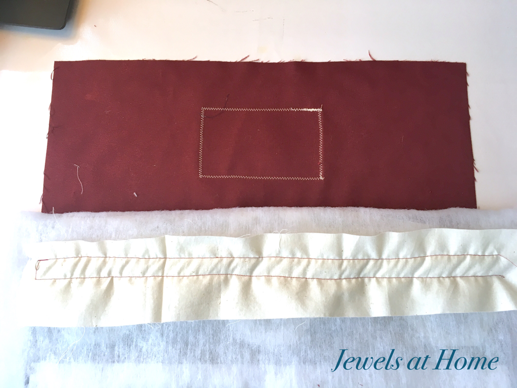 Next, I added the velcro. For the velcro on the body of the bag, I sewed all the way through, since the velcro is on the outside fabric, and I didn’t mind having stitching on the inside. However, for the velcro on the inside of the flap, I didn’t want the stitching to show on the outside, so I used more scrap fabric for backing, and I sewed the velcro to the inside fabric, batting, and scrap fabric, as shown below.