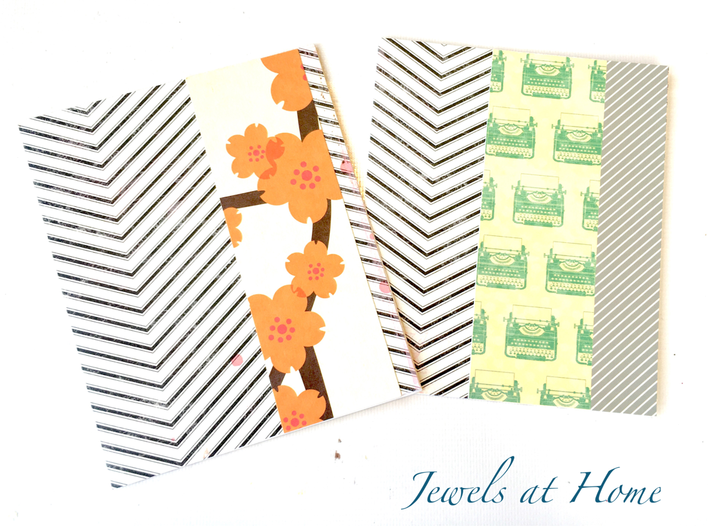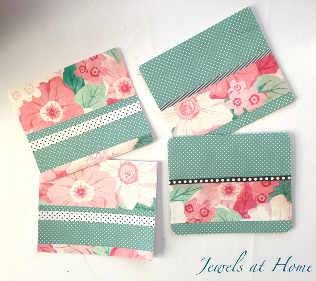 I used the same basic idea I shared in this post on quick DIY cards, but I varied the papers and added some fun washi tape as well. The other addition to these cards was using a corner rounder to add some interest. Still a straightforward project, and I love how each card turned out so unique!