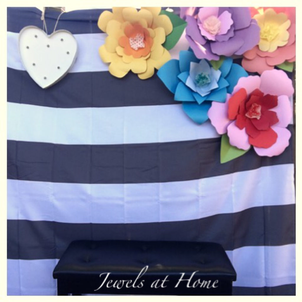 Here’s how the flowers looked in our photo booth. The backdrop is a striped shower curtain.
