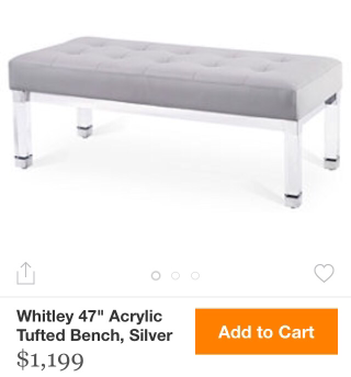 Whitley Tufted Bench. This bench feels less like going out on a limb than some of the other pieces. I think it is because the top surface, which catches more of your eye, is a traditional upholstered surface. The clear legs add just the right amount of sparkle and glamour. Statement pieces are great, and so are subtle touches like this one.