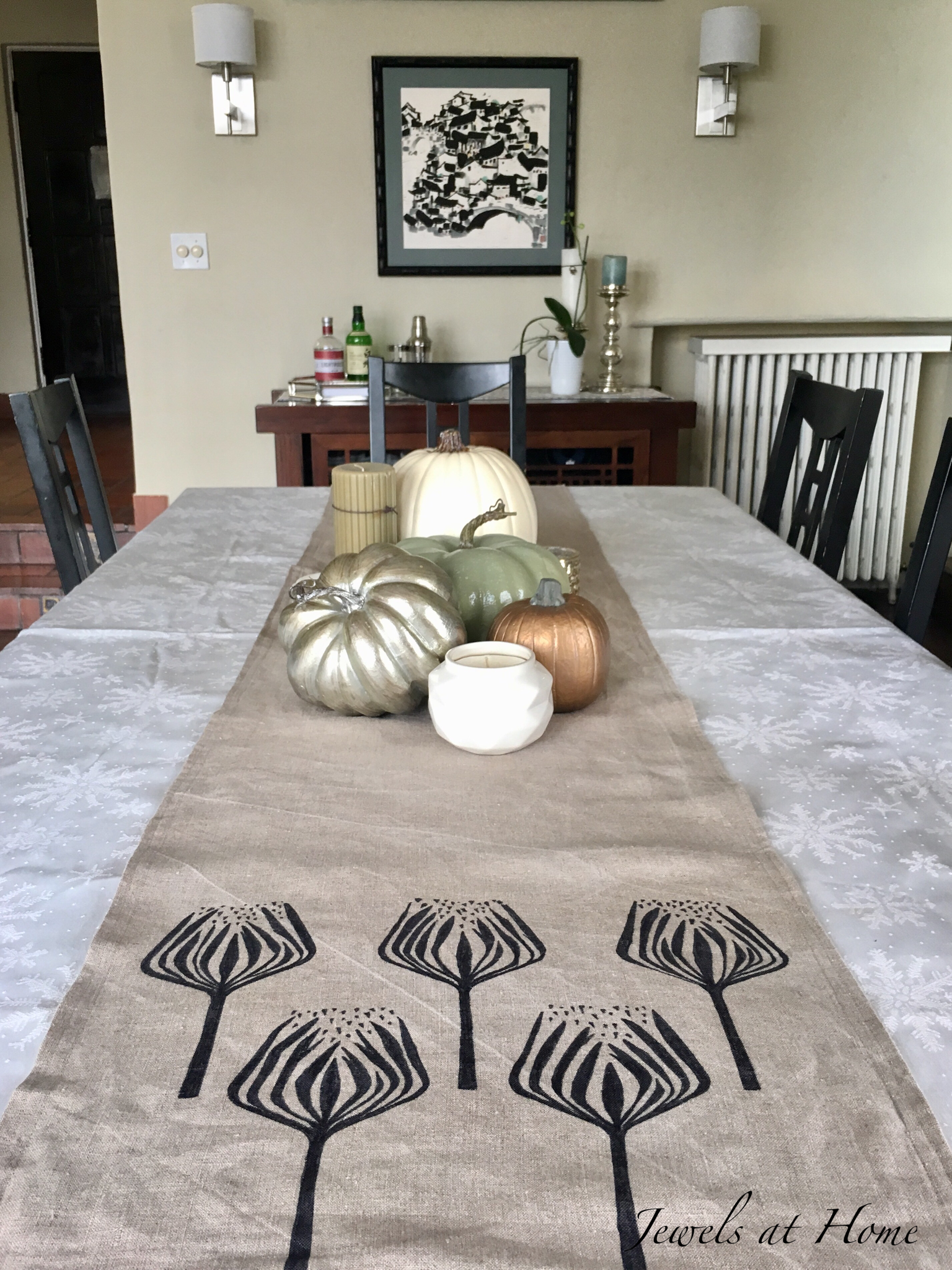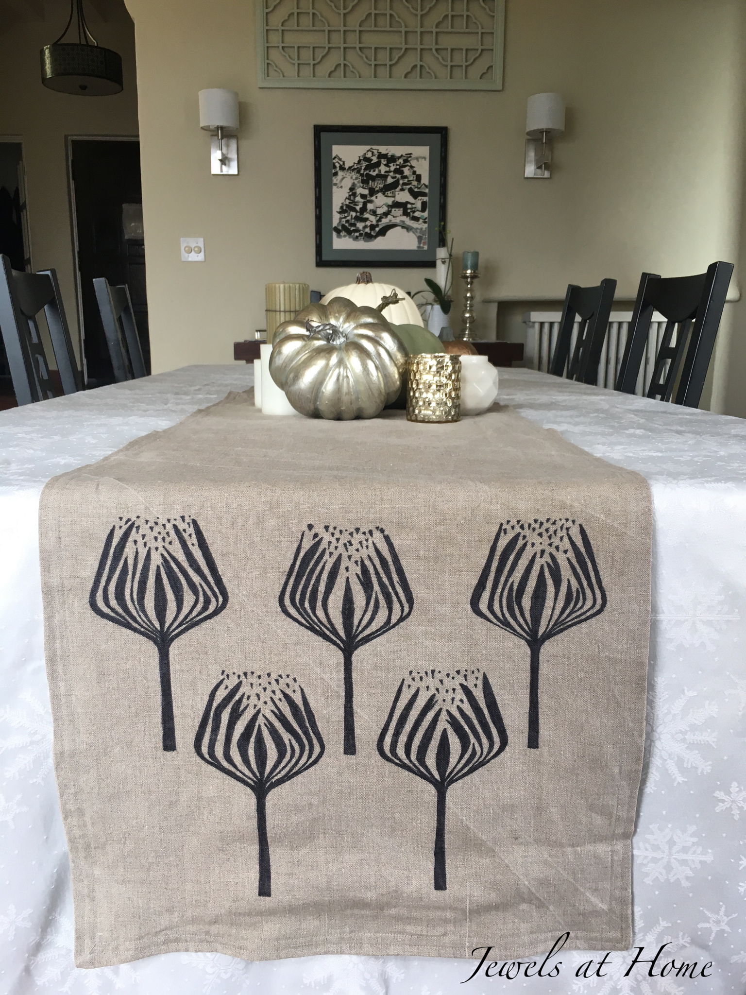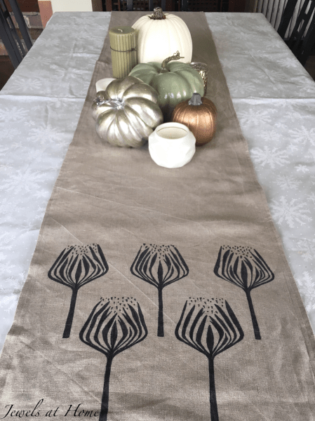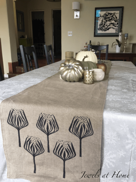 Remember when I painted our Gold Feather Table Runner? It was one of a pair of linen table runners that I am making for our Thanksgiving dinner this year. I am so excited to host my coworkers and their families!