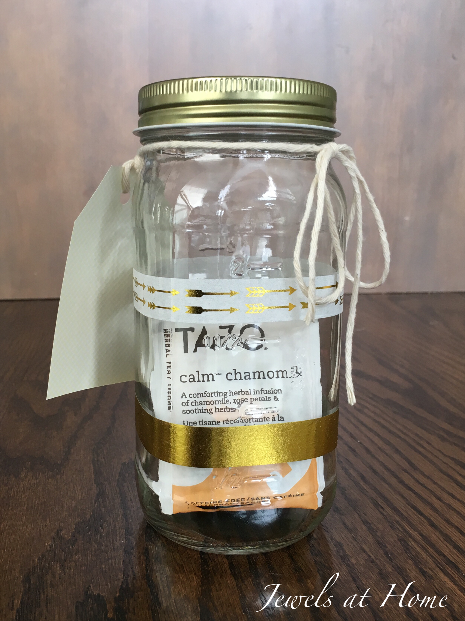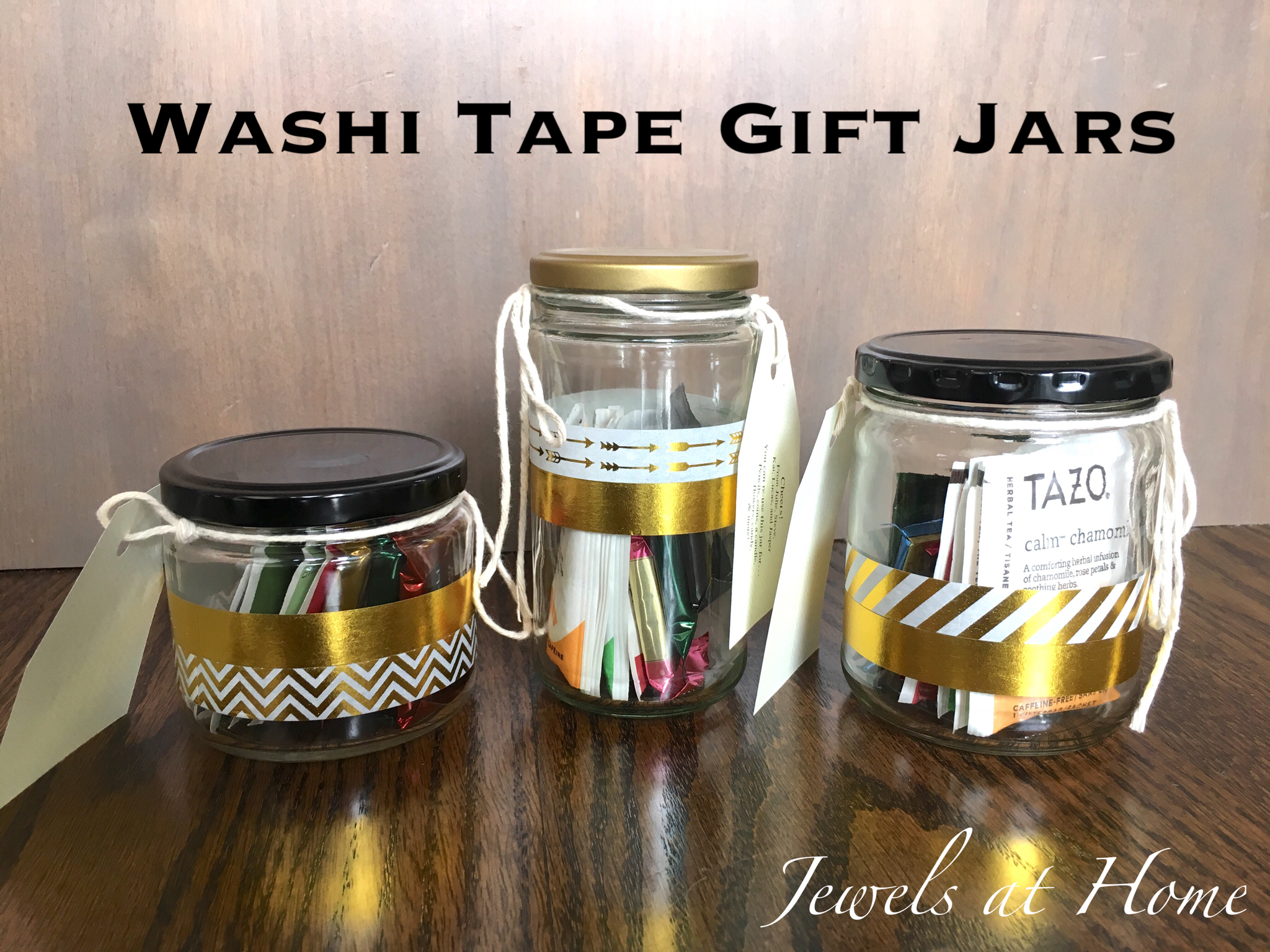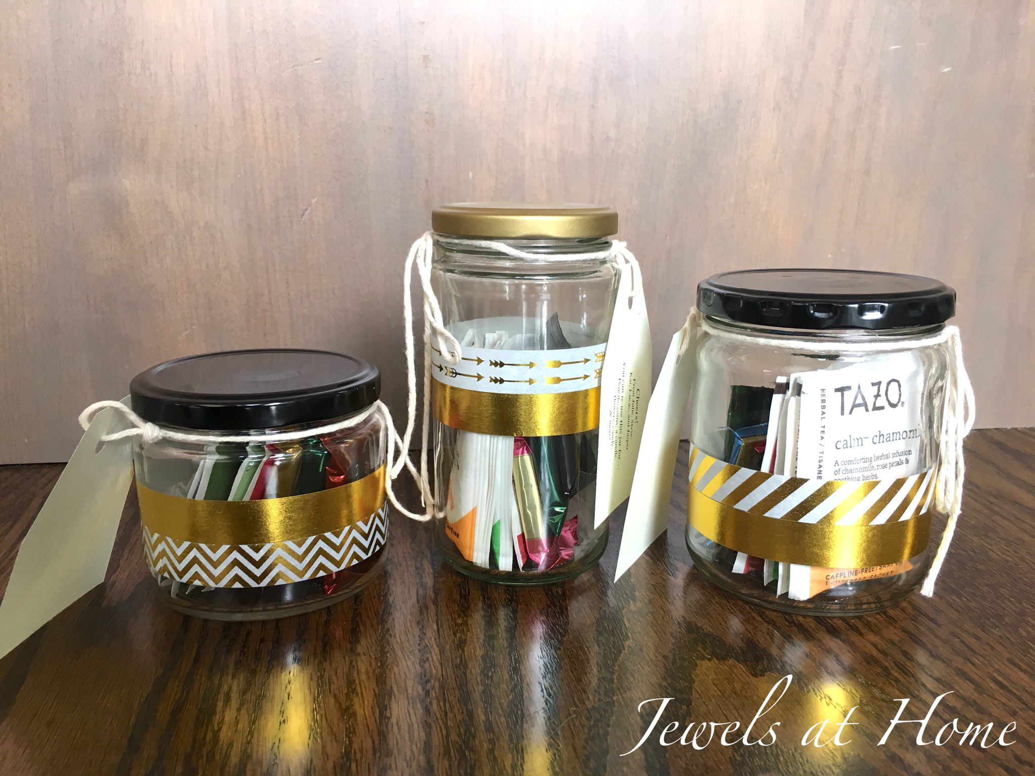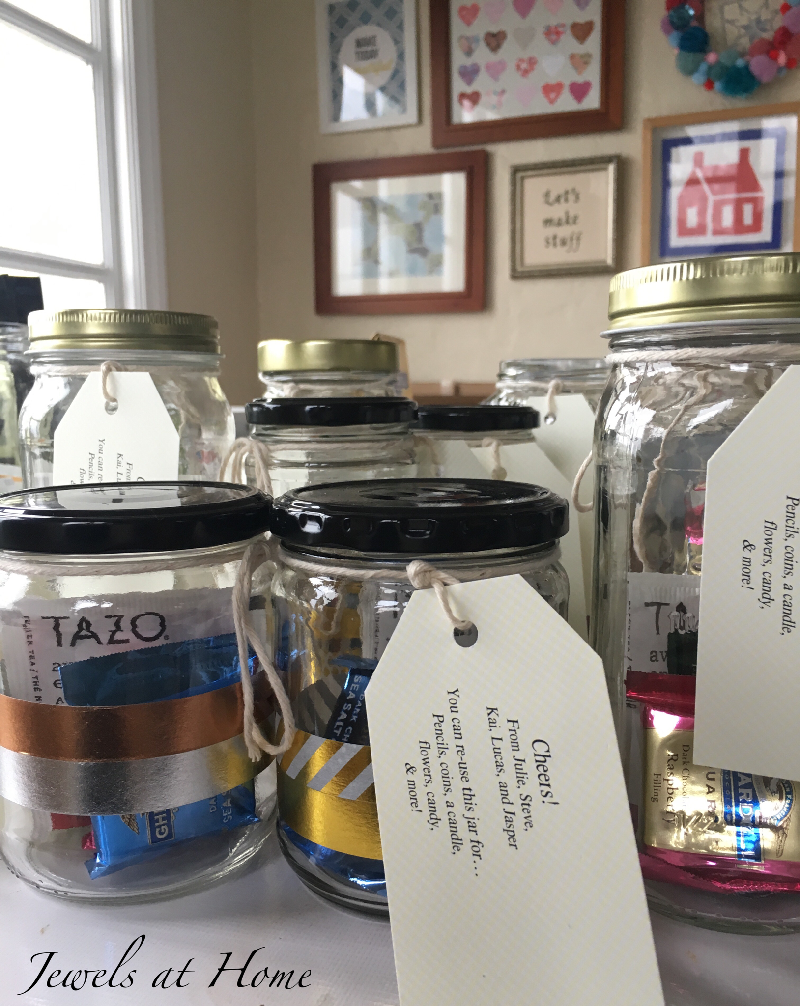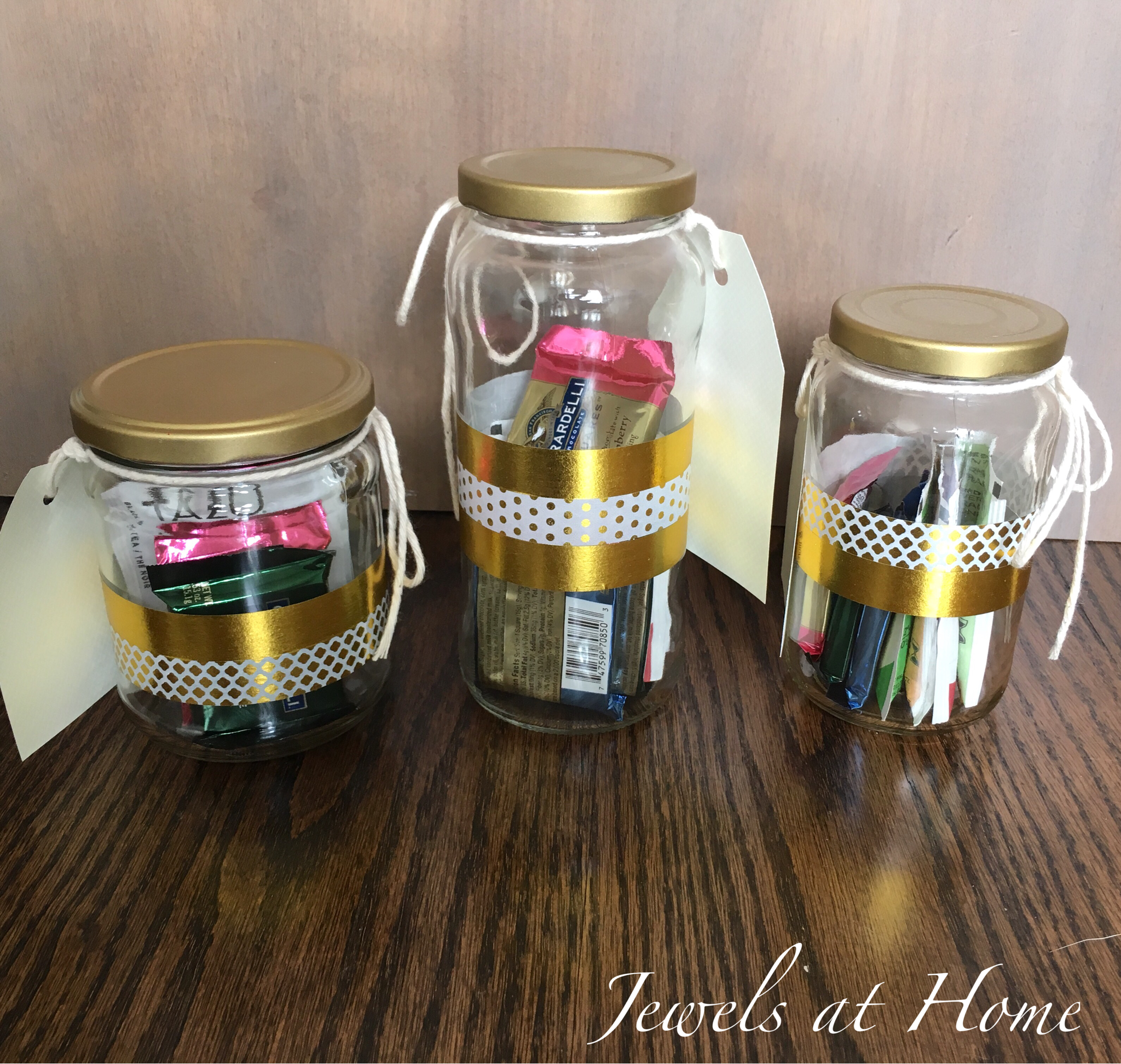 After washing the jars thoroughly, I used spray paint to paint the lids that had writing on them. I kept the ones that were already solid black or gold. Next, I added bands of washi tape to the glass. The little gift tags have ideas for ways to reuse the jar, such as for pencils, flowers, coins, candles, candy… that’s just what occurred to me. I am sure you can think of even more uses!