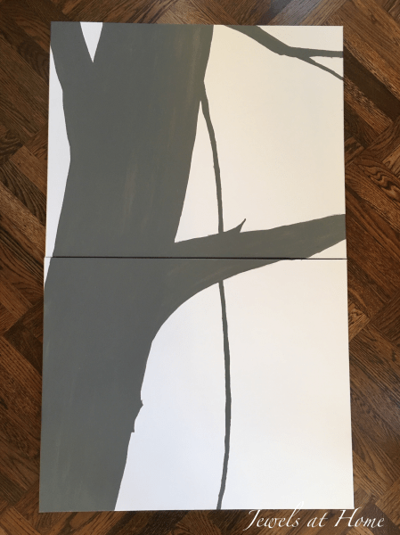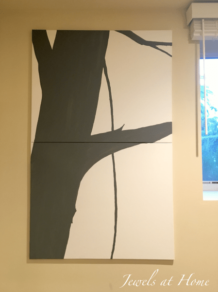 My inspiration for this painting was the beautiful work of Celine Ziang. While mine is a far simpler version of her gorgeous pieces, it was fun to create something made just for our space. It almost maybe feels like you are looking out of a treehouse window!