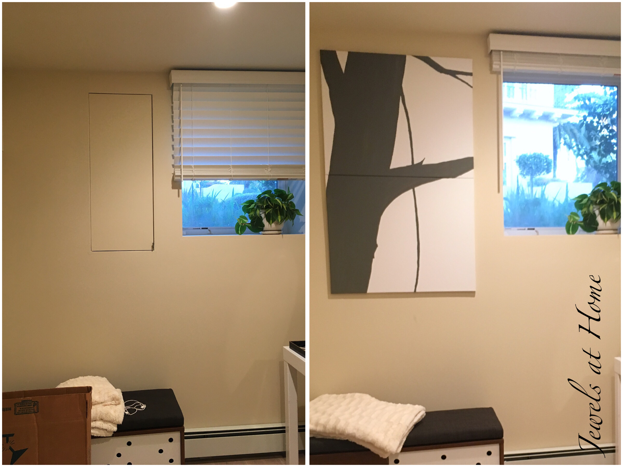 One challenge was how to hide the access panel for our water shutoff. Another challenge was to make this subterranean room feel more airy. I solved both problems with this painting – the canvas covers the panel door, and the bright tree silhouette makes the room feel more open.