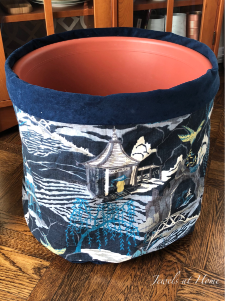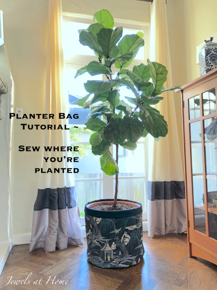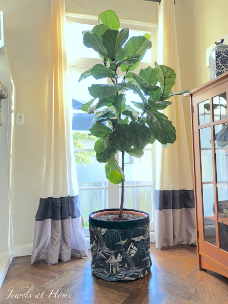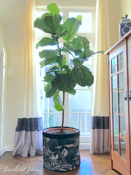 Since I’ve become a crazy plant lady, I’m always looking for planters to hold my collection. Big plants like my fiddle leaf figs (see how to propagate them here) can get heavy, so I try to put them in plastic planters…. but those don’t always have the look I want… so I’ve been trying to dress them up. I’ve hidden some planters inside baskets, and now, for my big tree, I decided to make a fabric bag to dress up the plastic pot.