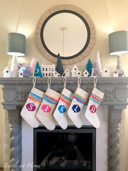 Yup, I have become one of those people who does a themed Christmas each year. I am still not sure if this is a sign of greatness of madness! While I admit to having accumulated many boxes of decorations, I do try to reuse items that can be adapted to each year’s theme. At the bottom of the post, you will see links to all the past lives of my plain white stockings. This year, they are dressed up in Anthropologie-inspired bohemian pom-pom trim! I pulled this off in a morning with my good friend, Ariana from Revolving Decor.