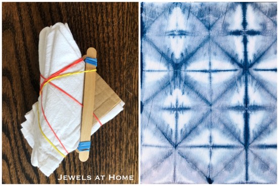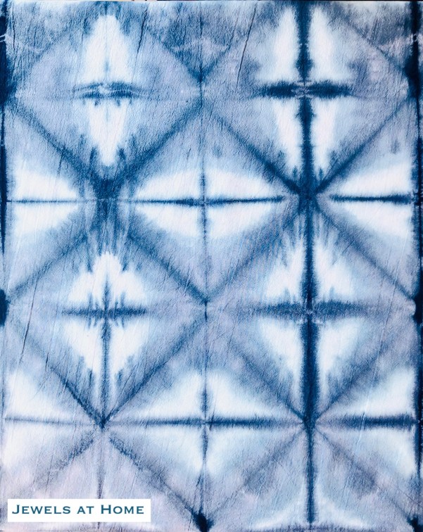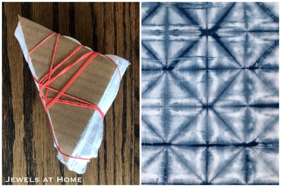 This is a variation of the triangles. To make it, accordion-fold your fabric to make a long, thin strip, then accordion-fold at 45 degrees to create the triangles. Attach a triangle of cardboard on the top and bottom and wrap securely with rubber bands. I used popsicle sticks to block the dye more effectively from the tip of the triangle.