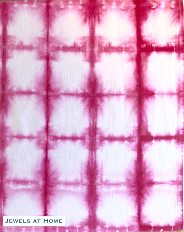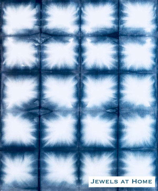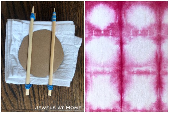 This starts like the squares – accordion-fold the fabric in one direction and then repeat this in the other direction to make a stack of squares. I cut pieces of cardboard in a circle shapevfor the two ends and bound it sticks and rubber bands. The circles are most distinct on the ends (top of picture) and less distinct on the inside (bottom of picture).