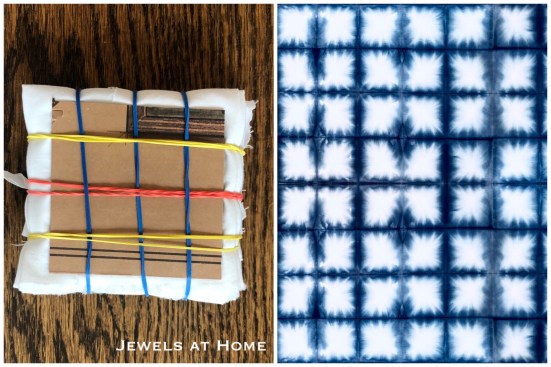 Accordion-fold the fabric in one direction and then repeat this in the other direction to make a stack of squares. I cut pieces of cardboard for the two ends and bound it with rubber bands.