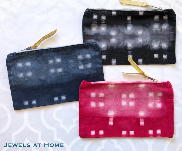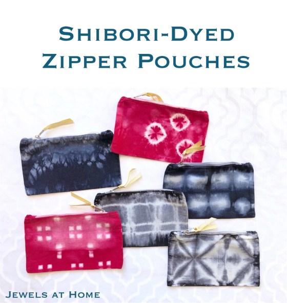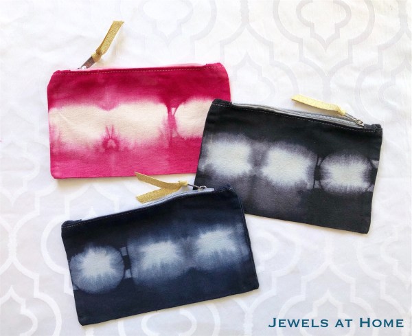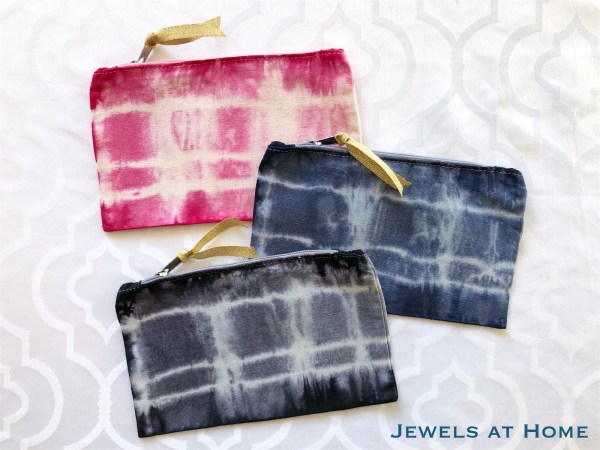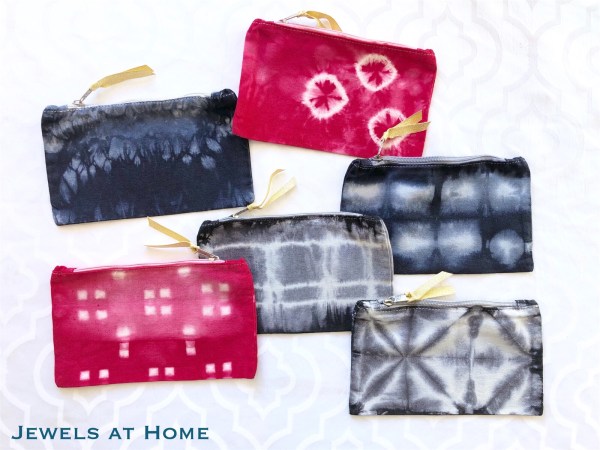 This years’s project is shibori-dyed zipper pouches. These have so many uses – as a mini clutch purse or a case for pencils, toiletries, jewelry, phone chargers and earbuds, etc.!