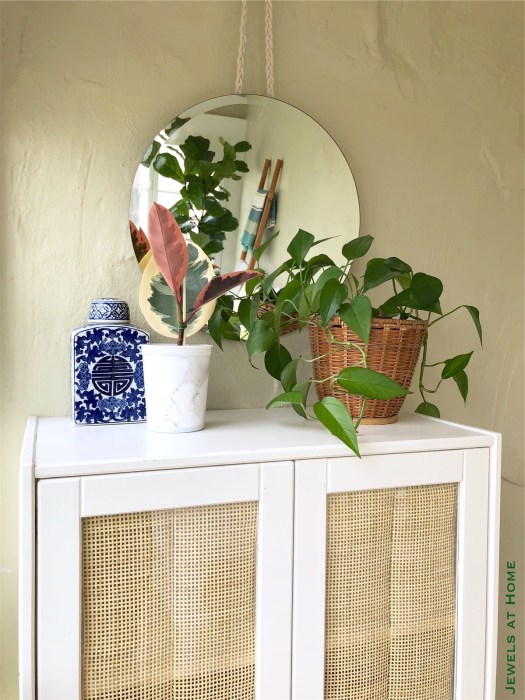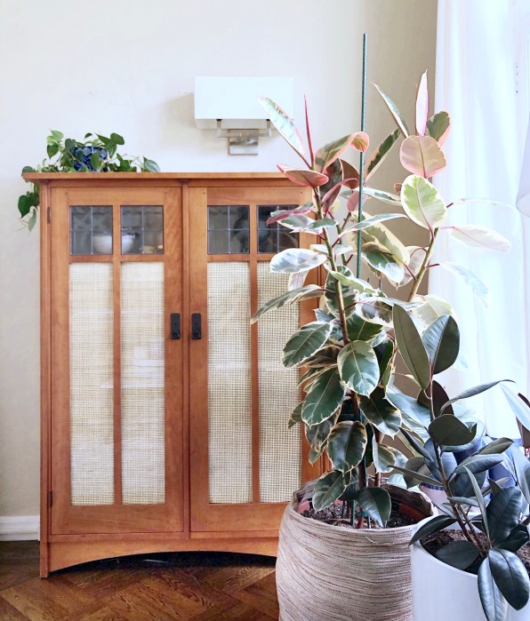 This white cabinet is about 30 years old – my grandmother bought it from Ikea (!) when she moved to Canada. My mom took it later, and when Steve and I brought it to our house, we painted them white and added these crystal knobs. Glad to see this piece get yet another life in our newly-decorated sunroom! I used leftover caning here, so there is a join in the middle, but I don’t mind in this more casual space.