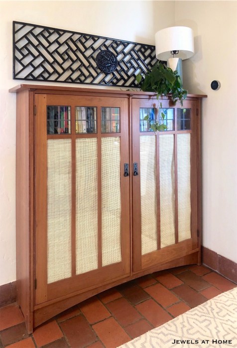Today’s project was a simple way to add caning to the inside of a cabinet with glass doors. I had four of these in our house and updated all of them! Besides giving a new look, the caning hides any clutter (what clutter?) inside.