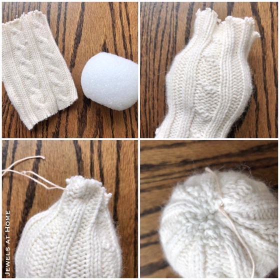 So, you may have seen that I recently bought some sweaters from the thrift store and made cozy pillow covers. There were still the sleeves, collar, and other parts of the sweater left, and I wanted to find a use for those, too. I was browsing for ideas and saw some adorable knit ornaments – umm, I mean general fall/winter decorative balls… so I decided to make some of my own.