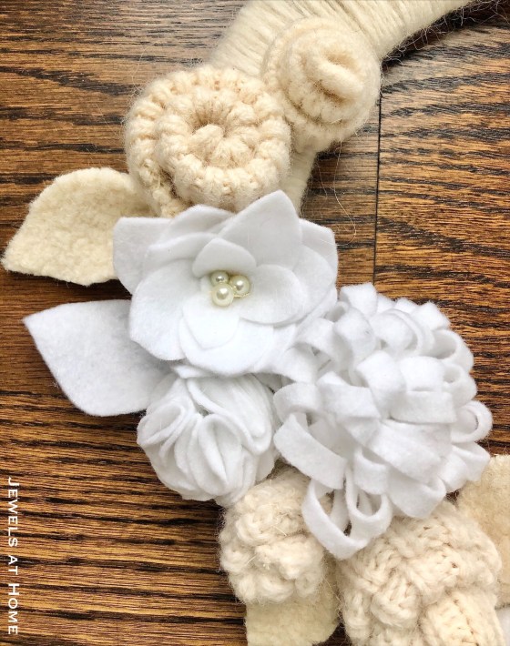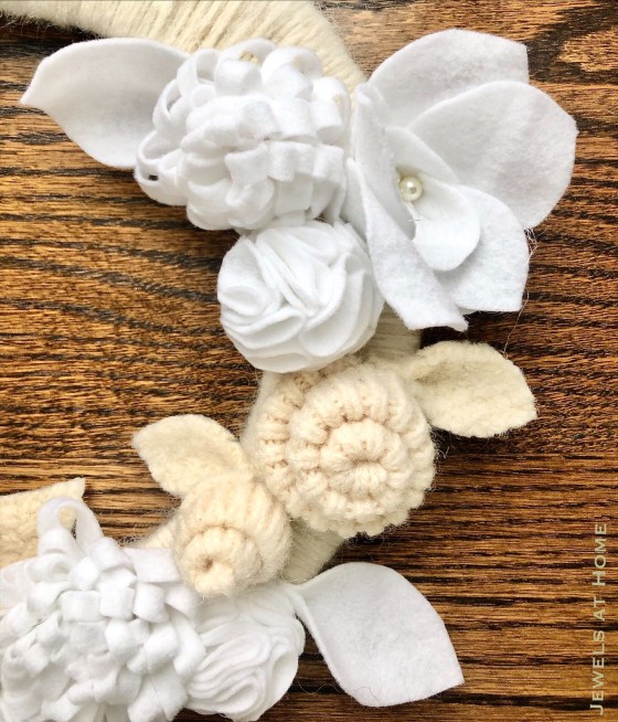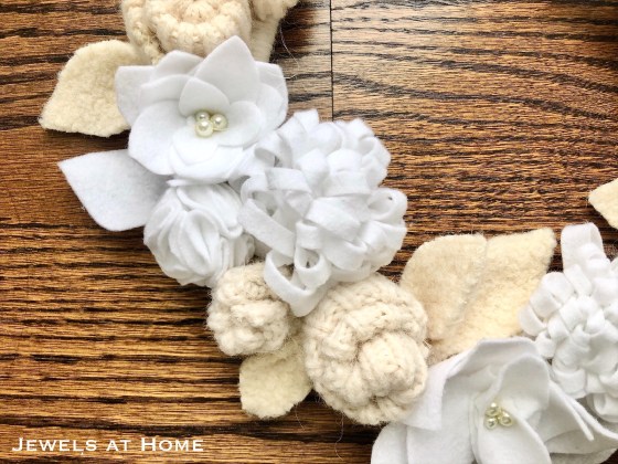 - Create flowers and leaves from felt and old sweaters/ felted sweaters (I used some of the trim from the thrift store sweaters I bought to make sweater pillows and sweater ornaments)