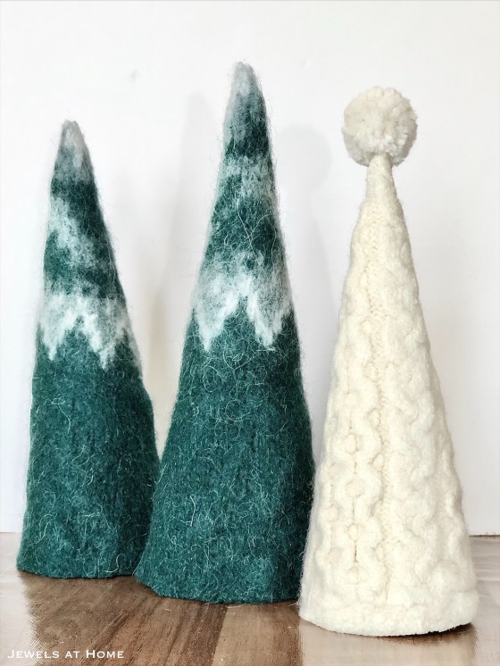 And here are the trees made from felted sweaters. I had both of these sweaters since I was a teenager – the Aran sweater is one my family bought on a trip to England, and the green one was knitted by my mom! Both are too scratchy and warm for California, but I love that I get to still enjoy them.