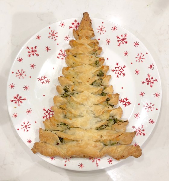 We throw a big holiday party every year. Last year, I introduced these puff pastry Christmas trees, and they’ve become a hit and a staple of the party. I got the idea from seeing a puff pastry Christmas tree with pesto, and I adapted it with cheese and veggies.